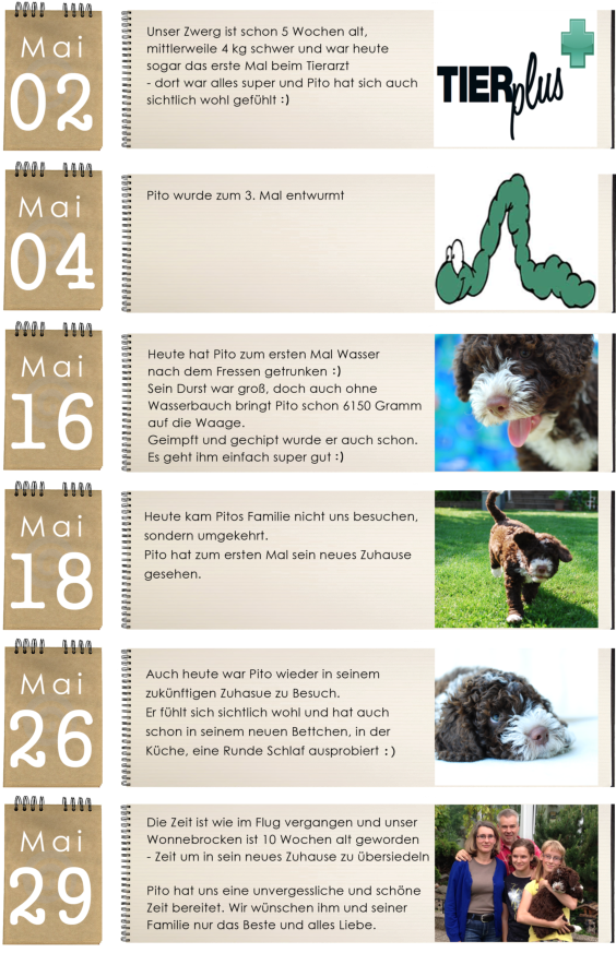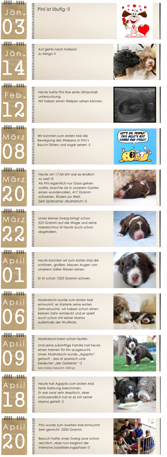 ein Wurf von unserer Chica Canis Marinus“Pingwin” und Gonnagitcha’s Mikel Laboa “Mingo”Auf der Suche nach dem passenden Rüden haben wir vor allem auf die Gesundheit und Gesamterscheinung viel wertgelegt. Unserer Meinung nach, haben wir den perfekten Papa gefunden - Gonnagitcha’s Mikel Laboa (Mingo). Ein unglaublich liebenswerter und prächtiger Rüde, der in der Nähe von Amsterdam zu Hause ist. Informationen über unseren Hundepapa:“ M i n g o” Gonnagitcha’s Mikel Laboa Gesundheitsergebnisse: HD - B ED - frei PRA - frei Goniodysplasie - frei Frei von vererbbaren Augen- krankheiten weiters: Uneingeschränkte Zuchtzulassung Wesenstest: bestanden In unserer Galerie findet ihr Fotos von unserem Besuch bei Mingo in Holland. - unser kleiner, aber feiner A Wurf :DZuchtname:Agapito mi Amigo Mojado Rufname: “Pito” Geschlecht:Rüde geboren am: 20.3.2013 Farbe: Braun - WeißWohnwort: bleibt in Wien :D Am 20.3.2013 erblickte unser leiner Zwerg das Licht der Welt. Pini und Mingo schenkten uns einen wundervollen und gesunden Rüden. Geschwisterchen hat er leider keine, aber dafür viele liebe Menschen, die sehr bemüht sind, ihm alles Wichtige auf seinen Weg mitzugeben. Und dann sind da natürlich noch seine liebevolle Hundemama und sein Opi (Frido), die den kleinen Tag für Tag umsorgen.